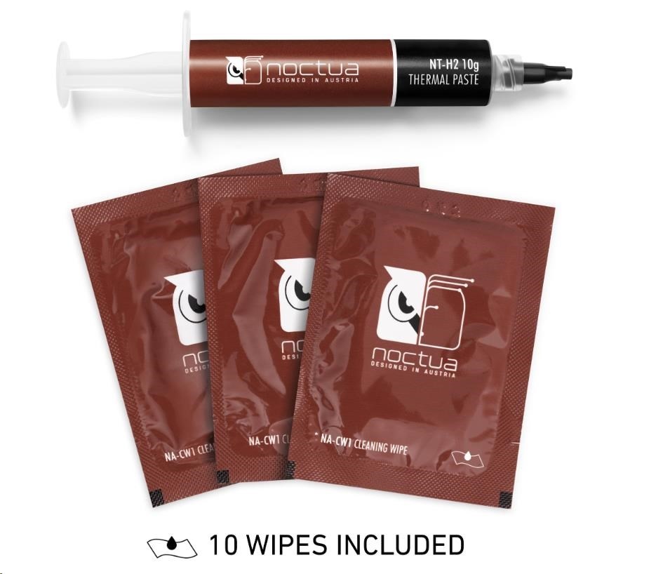 NT-H2 je dále vylepšená druhá generace oceněného hybridního tepelného vedení Noctua. Kombinací osvědčených vlastností ikonické pasty NT-H1, vynikající snadnosti použití a proslulé dlouhodobé stability s novým, jemně vyladěným složením mikročástic pro ještě lepší tepelný výkon je NT-H2 pastou pro nadšence pro nejvyšší nároky. Ať už jde o vzduchové nebo vodní chlazení, aplikace pro CPU nebo GPU, přetaktování nebo tiché systémy: NT-H2 bude důsledně poskytovat vynikající výsledky a díky přiloženým čisticím ubrouskům se stejně snadno odstraňuje jako nanáší.
