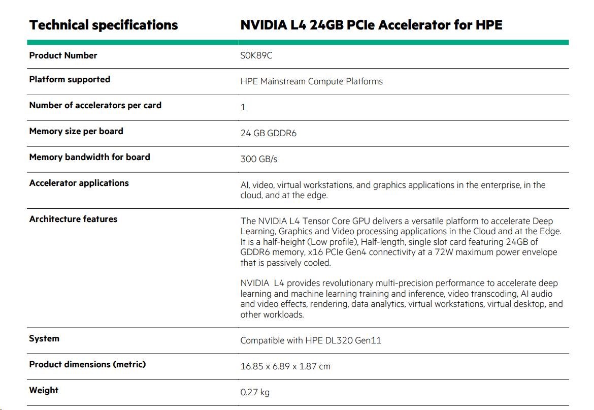 NVIDIA L4 24GB PCIe Accelerator for HPE S0K89CR RENEW.