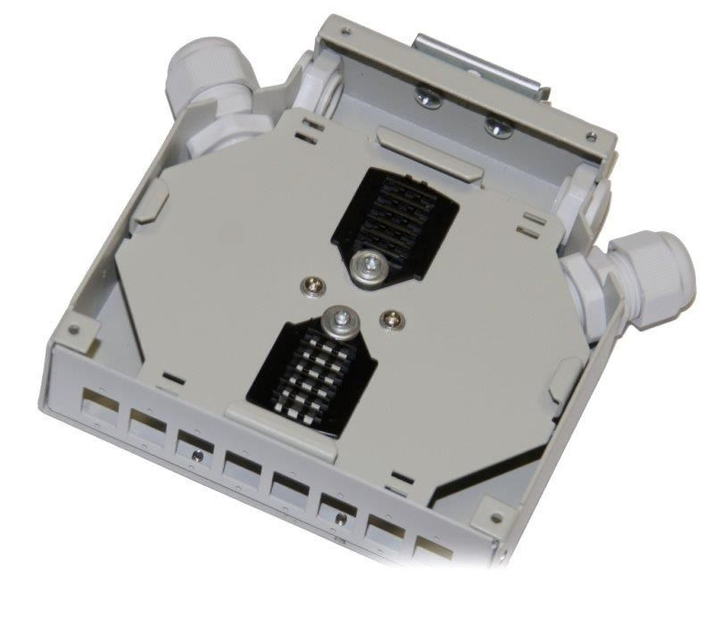 Optický rozvaděč na DIN lištu 8x SC simplex (8x LC duplex) s hřebínky na 16 svarů, bílý