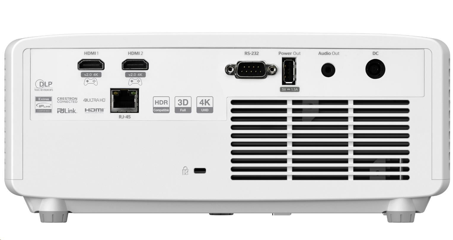 Použití projektoru:Home cinema; Skutečné rozlišení projektoru:4K UHD (3840x2160); Projekční poměr:16:9; Projekční vzdálenost (min) (m):1,3; Projekční vzdálenost (max) (m):9,5; Úhlopříčka obrazu (max) ("):300; Technologie:DLP; Zdroj světla:Laser; Kontrast (hodnota : 1):500000; Svítivost (v ANSI lumenech):4000; Rozhraní:HDMI, USB, 3.5mm Jack, LAN, RS-232.... více