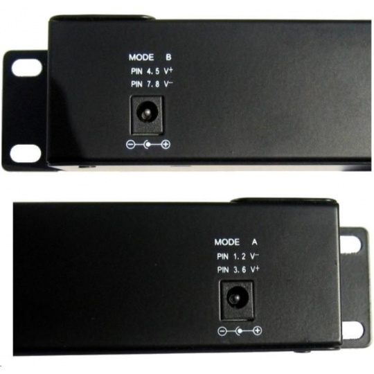 Vstup pro napájení prostřednictvím dvou 2.1mm 60V jacků, z obou vstupů je vždy zároveň napájeno všech 12 portů v režimu dle zvoleného A/B vstupu: