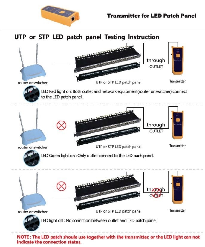 K patchpanelu dostanete vysílač, který připojíte do zásuvky např. v kanceláři a v serverovně na tomto patchpanelu jednoduše identifikujete pozici trasy na patchpanelu. Na patchpanelu se rozsvítí zelená LED. Další možnost je identifikovat volné trasy (bez připojeného zařízení). V serverovně připojíte vysílač signálu do patchpanelu a pokud je na konci trasy aktivní prvek, rozsvítí se na patchpanelu červená LED.