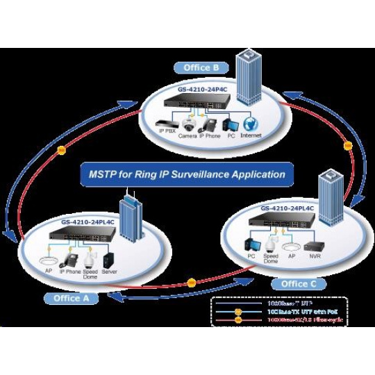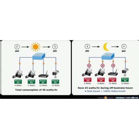 Gigabitový spravovatelný přepínač s PoE (power over ethernet) porty pro centralizované napájení zařízení po ethernetu jako jsou IP kamery, WiFi prvky nebo VOIP telefony. Zařízení je svým provedením vhodné jak pro instalaci do kancelářských nebo prezentačních prostorů. Je vhodné i pro aplikace v lokálních rozvaděčích, připojení lze realizovat optickýmy porty SFP. Bezpečnou správu zajistí šifrovaná webová správa nebo SNMPv3 protokol. Připojení koncových uživatelů lze zabezpečit ACL/MAC pravidly nebo možnou autorizací na server RADIUS/TACACS. Vlastnosti: - 28 portů 1000Base-T, Switching, Full Duplex (1000/2000 Mbps), Auto-Negotiation (10/100/1000 Mbps) - 24x vestavěné PoE injektory 802.3at, každý injektor až 30W/port; celkový max. napájený výkon až 440W - 4x SFP sdílené s metalickými (25-28), 100/1000Base-X, pro instalaci optických modulů mini-GBIC s označením MFB a MGB - Auto-MDI/MDI-X, automatická detekce přímý skřížený kabel i pro 10/100Mbps - ESD ochrana na všech portech do 2kV DC - 8k MAC adres, 4,1MB buffer - propustnost: 52Gbps sběrnice, datově 42Mp/s (64B) - podpora přenosu Jumbo rámců o velikosti 10KB - správa: WEB / SNMPv3 / telnet / konzole; podpora SSL/SSH - podpora protokolů IPv4/IPv6 - VLAN IEEE 802.1Q, až 256 skupin, až 4094 VLAN ID; protokolové, VoIP a privátní VLAN - agregace portů LACP 802.3ad, až 8 skupin po 8 portech - QoS 8 front, klasifikace podle provozu, váženého průměru nebo značky VLAN - Spanning tree protokol: STP IEEE 802.1D / RSTP IEEE 802.1w / MSTP IEEE 802.1s - IGMPv3 Snooping, Querier, až 256 multicast skupin - zrcadlení portů-port mirroring TX/RX/TX+RX/více na jeden port - zabezpečení klientů: ACL (access control list), MAC statická tabulka pro autorizovaná zařízení, autorizace na RADIUS/TACACS+, DHCP snooping, spojení IP+MAC na porty - ochrana proti DoS útokům - pole LED indikátorů pro diagnostiku provozu - tepelná ochrana proti přehřátí - rozměry: (440 x 300 x 44,5)mm, montáž 19"/1U - hmotnost 4,8kg - provozní teplota: 0-50°C - interní napájecí zdroj AC 110-240V/50-60Hz, vlastní příkon asi 30W.