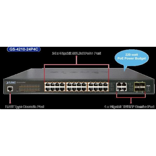 Planet GS-4210-24PL4C PoE+ switch 28x 1000Base-T, 4x SFP, 802.3at do 440W, VLAN, SNMPv3/WEB