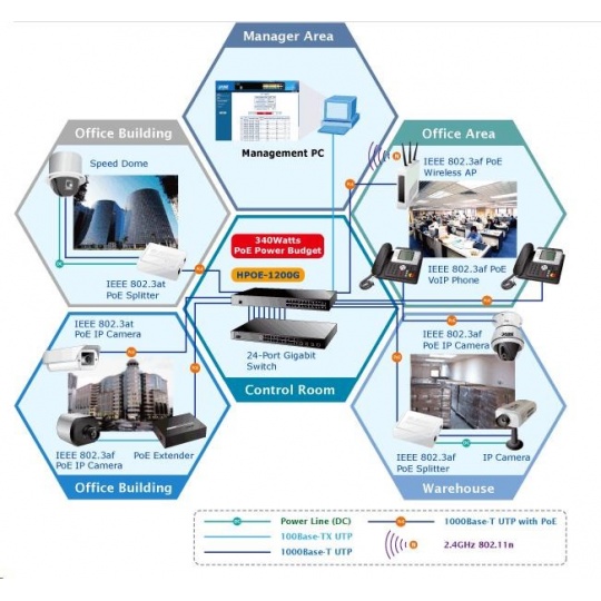 PoE (power over ethernet) Injektor HUB pro napájení zařízení po ethernetu podle IEEE 802.3af a vícepříkonových zařízení IEEE 802.3at. Je navržen pro napájení zařízení jako jsou PTZ nebo Speedome IP kamery, WiFi přístupové body nebo VoIP telefony. K dispozici je celkem 12 portů s celkovým výstupním výkonem 340W, injektor je průchozí, napájení přidružuje na již stávájící ethernet Cat5/5e/6 vedení. Pokud koncové zařízení nepodporuje IEEE802.3at budete potřebovat POE-161S, které pro danou kabelovou trasu napájení pro vzdálené zařízení poskytne. Vlastnosti: - 12 portů/injektory 802.3at, vkládané do trasy (in-line mid-span), (12 portů RJ-45 data-in, 12 portů data+power out) - IEEE 802.3, 802.3u, 802.3ab 1000Base-T - IEEE 802.3af, IEEE 802.3at, 52V DC PoE(power over ethernet) - každý port plně napájen - maximální úhrný odběr připojených PoE zařízení 340W - automatická detekce odběru na každém portu - ochrana portů před zkratem a vzájemnou interferencí - WEB správa zařízení - napájení zařízení: 230V AC, příkon až 370W - aktivní chlazení: 2 ventilátory - rozměry: 440 x 300 x 44 mm, 1U/19" - hmotnost: 4,27kg.