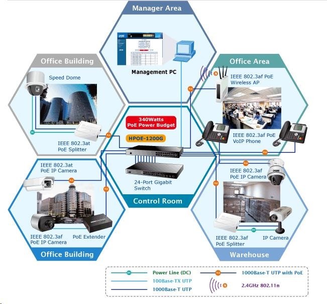 PoE (power over ethernet) Injektor HUB pro napájení zařízení po ethernetu podle IEEE 802.3af a vícepříkonových zařízení IEEE 802.3at. Je navržen pro napájení zařízení jako jsou PTZ nebo Speedome IP kamery, WiFi přístupové body nebo VoIP telefony. K dispozici je celkem 12 portů s celkovým výstupním výkonem 340W, injektor je průchozí, napájení přidružuje na již stávájící ethernet Cat5/5e/6 vedení. Pokud koncové zařízení nepodporuje IEEE802.3at budete potřebovat POE-161S, které pro danou kabelovou trasu napájení pro vzdálené zařízení poskytne. Vlastnosti: - 12 portů/injektory 802.3at, vkládané do trasy (in-line mid-span), (12 portů RJ-45 data-in, 12 portů data+power out) - IEEE 802.3, 802.3u, 802.3ab 1000Base-T - IEEE 802.3af, IEEE 802.3at, 52V DC PoE(power over ethernet) - každý port plně napájen - maximální úhrný odběr připojených PoE zařízení 340W - automatická detekce odběru na každém portu - ochrana portů před zkratem a vzájemnou interferencí - WEB správa zařízení - napájení zařízení: 230V AC, příkon až 370W - aktivní chlazení: 2 ventilátory - rozměry: 440 x 300 x 44 mm, 1U/19" - hmotnost: 4,27kg.