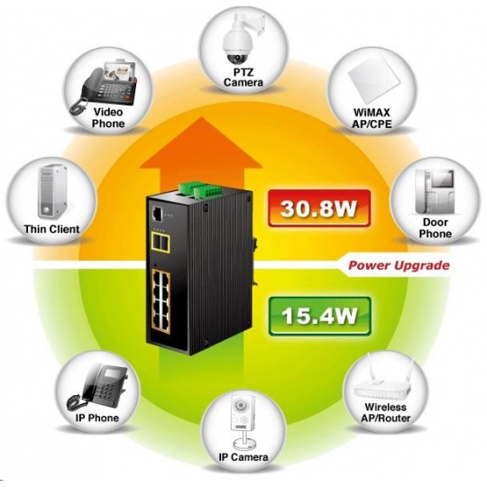 Planet IGS-10020HPT PoE switch 8x 1000Base-T, 2x SFP, 802.3at 270W, IP30, -40 až 75°C, SNMP, IGMPv3, IPv6