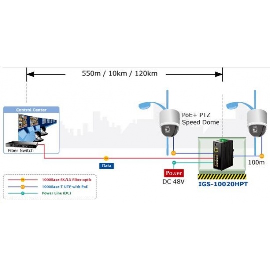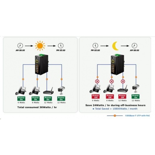 Planet IGS-10020HPT PoE switch 8x 1000Base-T, 2x SFP, 802.3at 270W, IP30, -40 až 75°C, SNMP, IGMPv3, IPv6 Inteligentní přepínače pro průmyslový Ethernet jsou určeny do náročných provozních podmínek s velkým rozsahem pracovních teplot, nejistým napájením a častými otřesy. Zároveň poskytují vynikající možnosti vícenásobných propojení pro dosažení robustnosti propojení systémů s velmi nízkou dobou zotavení. IGS-10020HPT je vybaven pro redundanci kromě dobře známé metody Spanning Tree (jejíž doba zotavení je v řádu sekund) především specializovanou funkcí "Redundant ring" která má dobu zotavení a nalezení nové cesty do 300ms. Jako PoE přepínač umožňuje přímo napájet až 8 koncových zařízení dle normy IEEE 802.3at, je tak ideálním prvkem pro aplikace se sníženou možností napajení. Přepínače řady IGS se snadno instalují na standardní DIN lištu nebo přímo na zeď a umožňují nasazení dobře známé Ethernetové technologie i v průmyslovém prostředí. Stejně tak jsou vhodné pro instalace do venkovně umístěných skříní s velkým kolísáním pracovních teplot (typicky bezdrátové a MAN ISP aplikace). Vlastnosti: - 8 portů 1000Base-T, Switching, Full Duplex (1000/2000 Mbps), Auto-Negotiation (10/100/1000 Mbps), automatická detekce přímý/křížený kabel na každém portu - na všechny implementace PoE IEEE 802.3at injektory se zatížitelností 30W/port, celkově až 270W - 2 porty SFP pro instalaci modulů 1000Base-SX/LX/BX nebo 100Base-FX - propustnost: sběrnice 20Gbps, 14,8Mp/s (64B) - podpora Jumbo Frame do 9kB, 8k MAC adres, buffer 4Mbity - 255 VLAN IEEE 802.1Q sítí, MAC nebo protocol based VLAN, VoIP VLAN - agregace linek "port trunking" IEEE 802.3ad LACP - IGMP v1,v2,v3 až do 256 multicast skupin, IGMP querier mode - 8-úrovní QoS prioritizace provozu dle portu, DSCP/ToS, 802.1p nebo 802.1Q značky - podpora Spanning Tree IEEE 802.1d, Rapid Spanning Tree IEEE 802.1w - IP/MAC ACL (access control list) do 123 pravidel, MAC/IP binding - DHCP snooping - port shaper - administrace Web/SNMPv3 s podporou zabezpečeného přenosu SSH/SSL - podpora IPv4/IPv6 - PoE scheduler pro možnost zapínání/vypínaní napájení podle časového plánu - pole LED indikátorů pro diagnostiku provozu - instalace na DIN lištu, montážní díl součástí - instalace na zeď, montážní díl součástí - krytí IP30 - napájení: 48V DC redundantní, připojení možné ze dvou různých zdrojů (nejsou součástí balení); vlastní příkon do 30W - ochrana proti přepólování, připojení napájení na svorkovnici, umístění na spodním panelu (nepřekáží při montáži na zeď) - přepěťová ochrana napájení do 6kV proti napěťovým špičkám (EFT) - přepěťová ochrana LAN portů do 6kV proti elektrostatickému náboji (ESD) - spínací poplachové relé (24V/1A) při výpadku primárního napájení - zařízení je odolné proti pádu (IEC-60068-2-32) z výšky 75cm na všechny dopadové části - zařízení je odolné proti vibracím (IEC-60068-2-6) 10-500-10Hz, 4x g, 0,5oct/min - zařízení je odolné proti přetížení krátkodobému zrychlení 50g, dlouhodobému 4g, (IEC-60068-2-27) - EMI/EMS, elektromagnetická kompatibilita a slučitelnost dle CE EN-6100-4-2,3,4,5,6 - elektrická bezpečnost dle CE EN-60950 - pracovní teplota -40 až 75°C, vlhkost do 95% - hmotnost: 1684g - rozměry: 152 x 107x 72 mm.