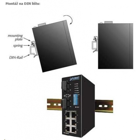 Planet ISW-511T, 4x 10/100Base-TX+ 1x 100FX 2km, MM, DIN, IP30, -40~75°C Přepínače pro průmyslový Ethernet jsou určeny do náročných provozních podmínek s velkým rozsahem pracovních teplot, nejistým napájením a častými otřesy. Přepínače řady ISW se snadno instalují na standardní DIN lištu nebo přímo na zeď a umožňují nasazení dobře známé Ethernetové technologie i v průmyslovém prostředí. Stejně tak jsou vhodné pro instalace do venkovně umístěných skříní s velkým kolísáním pracovních teplot (typicky bezdrátové a MAN ISP aplikace). Vlastnosti: - 4 porty 100Base-TX, Switching, Full Duplex (100/200 Mbps), Auto-Negotiation (10/100 Mbps), automatická detekce přímý/křížený kabel na každém portu - 1 port 100Base-FX, full duplex, SC konektory, multimodemode, pro 50/125um a 62,5/125um vlákno, dosah 2km, vlnová délka 1300nm, zdvih min. 15,5dB (vysílací výkon max. -14dBm, min. -19dBm, přijímací citlivost -34,5dBm) - 1M buffer, propustnost sběrnice 1Gbps, 0,74Mpps (64B), tabulka 2k MAC adres - pole LED indikátorů pro diagnostiku provozu - instalace na DIN lištu, montážní díl součástí - instalace na zeď, montážní díl součástí - krytí IP30, skříň celohliníková - napájení: 12-48V DC redundantní, připojení možné ze dvou různých zdrojů (nejsou součástí balení) - ochrana proti přepólování, připojení napájení na svorkovnici, umístění na spodním panelu (nepřekáží při montáži na zeď) - QoS prioritizace provozu dle portu, ToS, 802.1p - zařízení je odolné proti pádu (IEC-60068-2-32) z výšky 75cm na všechny dopadové části - zařízení je odolné proti vibracím (IEC-60068-2-6) 10-500-10Hz, 4x g, 0,5oct/min - zařízení je odolné proti přetížení krátkodobému zrychlení 50g, dlouhodobému 4g, (IEC-60068-2-27) - EMI/EMS, elektromagnetická kompatibilita a slučitelnost dle CE EN-6100-4-2,3,4,5,6 - elektrická bezpečnost dle CE EN-60950 - pracovní teplota -40 až 75°C, vlhkost do 95% - příkon do 14W - rozměry: 135 x 97 x 32 mm - hmotnost: 436g.