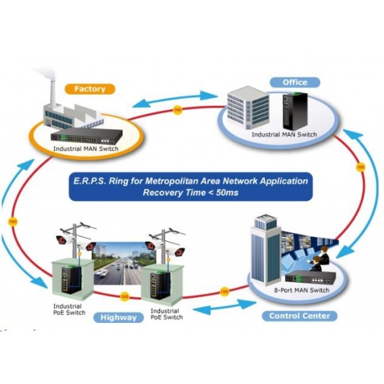 witch obsahující 8 x RJ-45 port s rychlostí 10/100/1000 Mbps a PoE napájením, 2 x RJ-45 s rychlostí 10/100/1000 Mbps sdílené s dvěma SFP porty. Navíc je vybaven interním ONVIF modulem pro detekci a info IP kamer v síti. Díky svému kovovému pouzdru s krytím dle certifikace IP30 odolává vysokým teplotám od -40°C do 75°C a i díky tomu je vhodný do těžkých provozů. Přepínací kapacita switche je 24 Gbps neblokovaně a propustnost činí 17,85 Mpps. Pro každý z osmi RJ-45 portů je k dispozici 36 W PoE výkonu, takže je možno napájet i energeticky náročnější zařízení. Taktéž jsou přítomny dva SFP porty pro rychlé datové přenosy na optické síti.ZÁKLADNÍ SPECIFIKACE