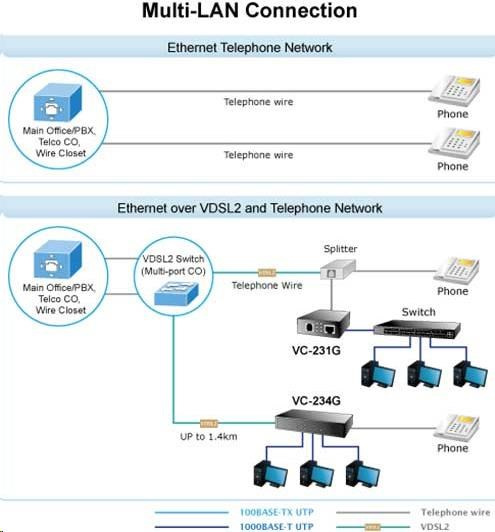 PLANET VC-231G Ethernet po telefonním vedení (technologie VDSL2). 1x LAN RJ-45, 1x VDSL2 RJ-11. Transparentní bridge. G.993.2 VDSL2, G.993.5 G.Vectoring + G.INP. Kapacitně 200/160Mbps na 200m. Dosah až 1,4km. Nastavení DIP přepínači, volitelně Master (CO) / Slave (CPE). Možný provoz na VDSL O2 lince. LRE (Long Reach Ethernet) konvertor ethernetu na VDSL2 (Very-high-data-rate Digital Subscriber Line 2) konvertor ethernetu dovoluje přenést data symetrickým párem vodičů rychlostí až 200Mbitů/s na 200m nebo 30Mbitů/s do vzdálenosti až 1,4km, přenosové rychlosti dle stavu a kvality použitého vedení. Zařízení je univerzální jako master (CO) / slave (CPE) jednotka, nastavení režimu přepínačem. Jednotka podporuje VDSL2 operační módy dle přenosových profilů "17a" a "30a", volbu dle "band Plan997" a G.993.5 G.Vectoring & G.INP postihující symetrický přenos dat vyšší rychlostí i na souběžném vedení. S pomocí externího spliteru lze zachovat hlasovou službu na telefonním vedení bez další úpravy zapojení. S výhodou tak lze využít telefonní kabelová vedení původně určená pro spojení nejen k účastníkům ale i mezi analogovými ústřednami. ISP (internet service provider) poskytovatelům je tak umožněno nabízet multimediální služby, VOD (video on demand), VoIP (voice over IP), Video phone, IPTV, apod. Aplikace VDSL2 s pokročilým G.INP a G.Vectoringem lze provozovat i v rámci aktivních prvků rozhraním SFP diky modulu XL-MGB-VDSL2-R2 (viz. doporučené příslušenství). Modem lze úspěšně provozovat nad VDSL linkami O2. ZÁKLADNÍ SPECIFIKACE Porty: 1 x 10/1000Base-T, RJ-45 1 x VDSL, RJ-11 Podpora přenosu: JumboFrame 2K MAC adres Soulad s normami: IEEE 802.3, IEEE 802.3u, IEEE 802.3ab, IEEE 802.3x, IEEE 802.3p Transparentní pro: IEEE 802.1Q VLAN tag Standard: ITU-T: G.993.1 - VDSL, G.997.1, G.993.2 - VDSL2 (profily 17a/30a), G.993.5 G. - Vectoring a G.INP, G.998 DIP přepínání: volba CPE/CO, volba modulace, volba komunikačního limitu, volba SNR Napájení: z externího adaptéru, 5V/2A Provozní teplota: 0 až 50°C, vlhkost <90% Rozměry: 97 x 70 x 26 mm Hmotnost: 184 g Lze instalovat do šasí: MC-700, MC-1500, MC-1500R Příklad dosahů a rychlostí (down/up Mb/s) na vedení s vodiči AWG24 a lepších: 200m -> 225.34Mb/122.39Mb 400m -> 151.89Mb/78.78Mb 600m -> 90.42Mb/49.93Mb 800m -> 57.70Mb/29.87Mb 1000m -> 45.33Mb/9.21Mb 1400m -> 34.74Mb/5.75Mb Nastavení pro O2 VDSL připojení modem v režimu CPE; další DIP přepínače Transmision, Band, SNR podle kvality linky v routeru na WAN rozhraní aplikovat VLAN ID:848 nad WAN nastavit PPPoE klienta, Login: O2/O2 dále věnujte pozornost nastavení vašeho routeru, jeho firewallu, přístupových práv, UPnP, atd..