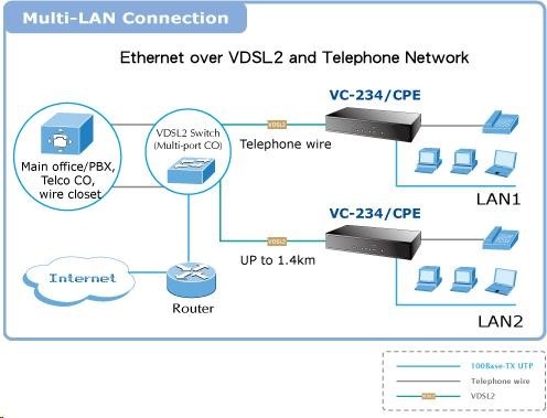 Planet VC-234, Eth. VDSL2 konvertor, 100Mbit, master/slave, 2x RJ-11, splitter, 4x RJ-45