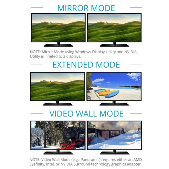 - Adaptér MST umožňuje použití tří módů: 1.Přenos dvou různých obrazů na dva monitory 2.Rozšíření jednoho obrazu na dvě obrazovky 3.Zobrazení dvou stejných obrazů na dvou monitorech