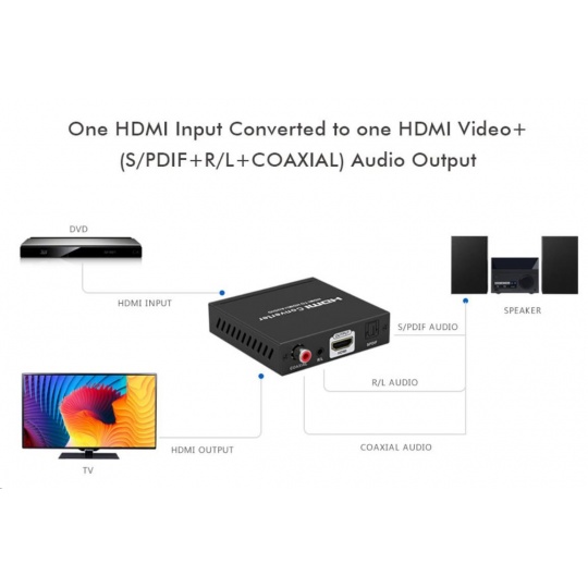 - Vyvede z HDMI audio signál na konektory: stereo jack, Digitální audio RCA CINCH nebo digitální optické TOSLINK