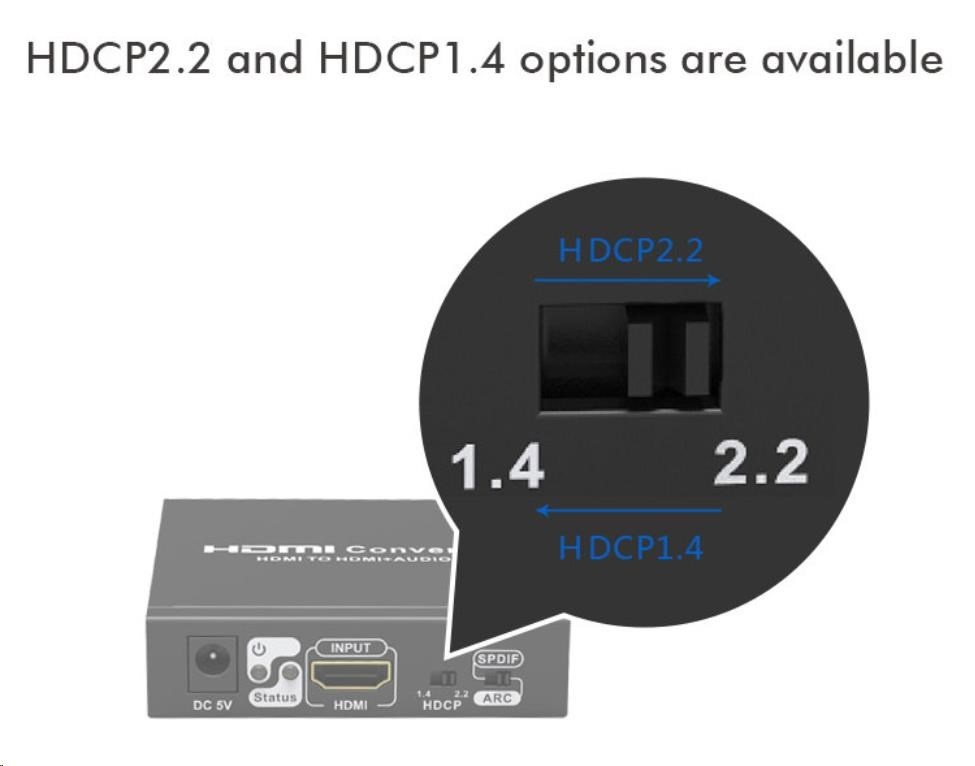 - Umožňuje propojit zařízení s různou verzí HDCP 2.2 a HDCP1.4 , k tomu slouží nastavitelný přepínač