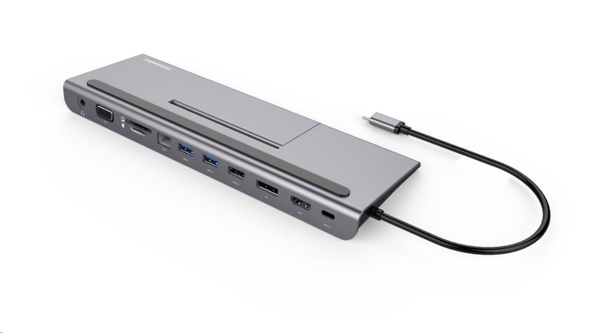 PREMIUMCORD Dokovací stanice USB-C 8v1, 1xDP, 1xHDMI, 1xVGA, 1xUSB-C, 3xUSB, 1xRJ45, šedá
