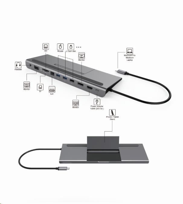 Dokovací stanice může sloužit jako podložka pod notebook, obsahuje čtečku SD karet, konektor RJ45 na připojení na počítačovou síť, 2x USB3.0 + 1x USB2.0, PD konektor 100W konektory a výstup audio na sluchátka nebo do reproduktorů.