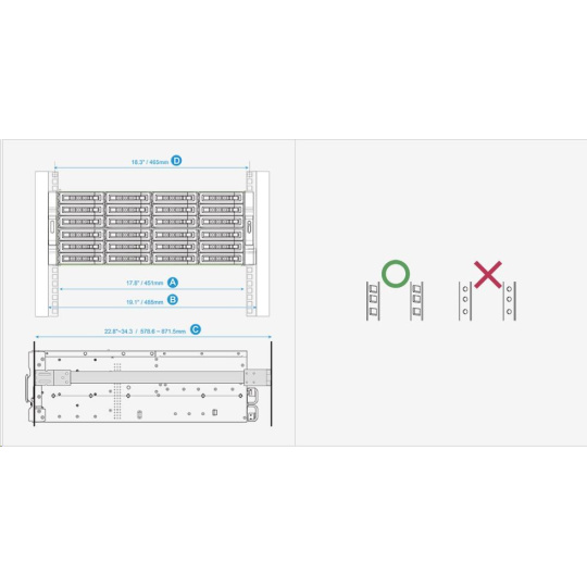 - Vzdálenost mezi dvěma rackovými sloupky (měření čtvercových otvorů racku střed-střed) je 18,3"(465 mm)