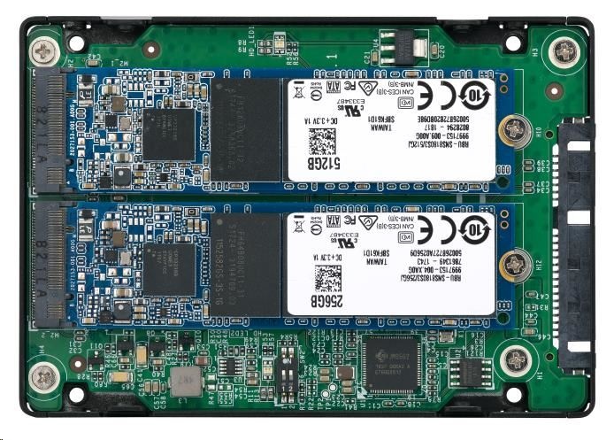 Použijte dva M.2 SATA SSD moduly v jedné 2,5” pozici pro diskové jednotky SATA s podporou RAID pro počítače a NAS