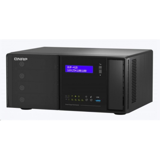 Síťový dozorovací NVR server QVP-41B podporuje video/audio monitorování v reálném čase, nahrávání ve vysokém rozlišení a přehrávání z více IP kamer. Funkci PoE switche poskytuje také zařízení QVP-41B – podporuje připojení všech druhů kamer a PoE zařízení a vytváří inteligentní dozorovací infrastrukturu pro velké i malé a střední podniky a rodiny. Se čtyřmi 3,5" pozicemi pro disky SATA, šestnácti 30wattovými gigabitovými porty PoE, dvěma kombinovanými porty RJ45 a dvěma 2,5GbE host management porty, poskytuje QVP-41B velký úložný prostor a vysokorychlostní síť s ohledem na požadavky malých/středních monitorovacích prostředí.