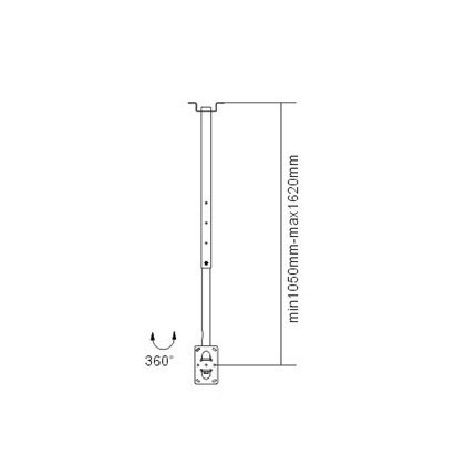"Stropní ocelový držák na velké LCD a Plasma TV s uhlopříčkou 23""- 63"" (58-160cm) a hmotností maximálně 75kg pomocí uchycení PLANO Flat 37""- 63"" (není součástí balení). Popis: výškově nastavitelný 87-156cm, není vertikálně výklopný, horizontálně otočný +180°/-180°, materiál je ocel, barva stříbrná.".