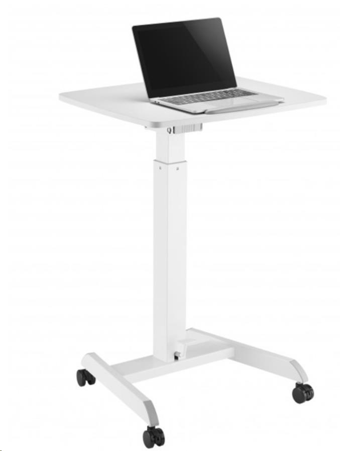 ERGOnomický pracovní stolek na laptop nebo projektor max 8kg s mechanizmem ovládaným nohou se vzduchovým pístem pro změnu výšky 76-113cm, náklon pracovní plochy 60x52cm 0-30°, vhodné pro sezení i stání nebo jako lektorský stolek, rozměry 60x53x76-113cm, barva bílá.