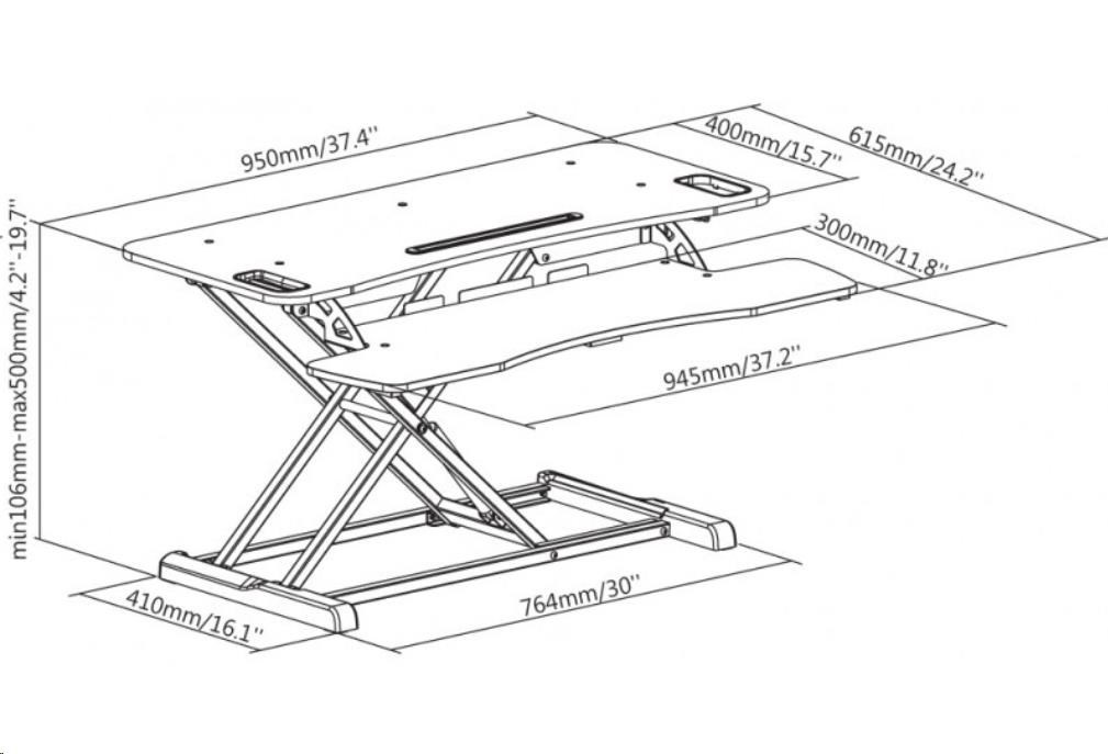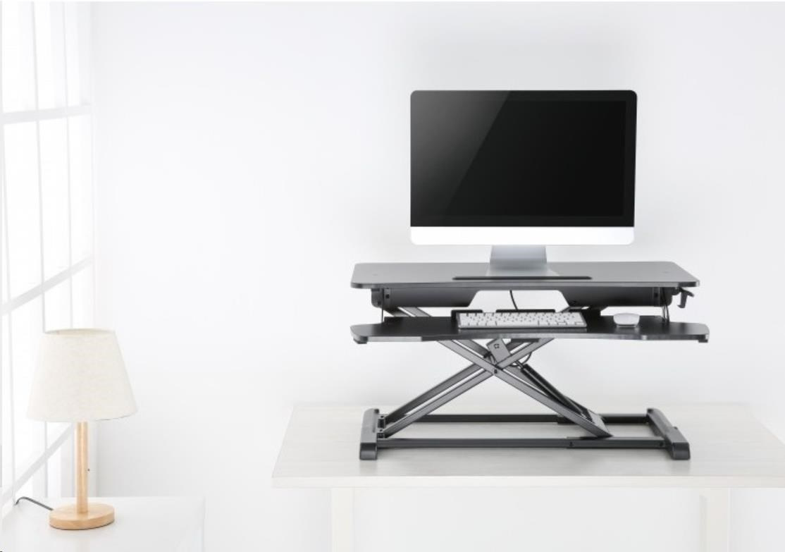 ERGOnomická pracovní plocha na laptop / monitor max 15kg a klávesnici max 2kg s X mechanizmem se vzduchovým pístem pro změnu výšky 10,6-50cm na stole, řešení změny pozice ze sezení na stání bez nutnosti úpravy kabeláže, rozměry 95x61,5x50 cm + plocha 94,5x30cm, barva černá.