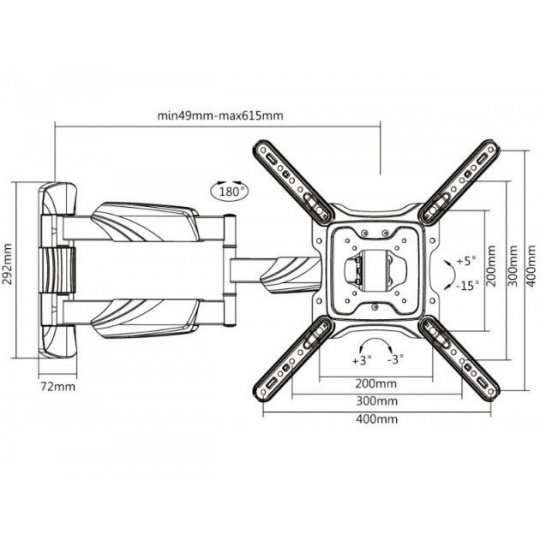 Nástěnný ocelový držák na LCD monitory a TV s uhlopříčkou 23"- 55" (58-140cm) a hmotností maximálně 35kg. 3x pant, vertikálně výklopný +5°/-15° a horizontálně otočný +90°/-90°, vzdálenost od stěny 49-615mm, materiál ocel, barva černá. Uchycení VESA: 75x75, 100x100, 100x200, 200x200, 300x200, 300x300, 400x200, 400x300, 400x400..