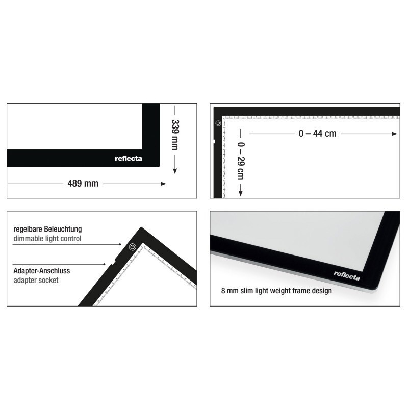 Prosvětlovací panel s moderní SuperSlim LED technologií, prosvětlovací plocha 19x14cm s měřítkem v cm na okraji plochy, plynulá regulace výkonu, dotykové ovládání, síťový zdroj AC/DC 12V/4,3W - 3,5mm Jack, životnost LED 50.000h. Rozměry 23,9x18,9x0,8cm, hmotnost 400g..