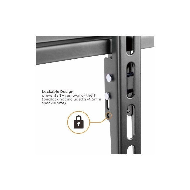Nástěnný ocelový držák na velké televizory s uhlopříčkou 37"- 75" (94-190cm) a hmotností maximálně 75kg. Konzole na zavěšení TV s upevněnými držáky vertikálně, VESA max 400x600, není výklopný, vzdálenost od stěny 27mm, rozměry 44,8x62,5x2,7cm, barva černá. Uchycení VESA: 200x200, 300x200, 300x300, 400x200, 400x300, 400x400, 400x600..