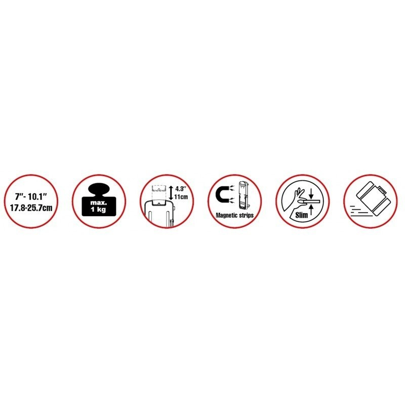 Stojánek pro tablety 7-11" v horizontální i vertikální poloze na zeď a kovovou plochu. 4x magnety a 2x vruty pro fixní uchycení, široká fixace tabletu ze dvou stran, lehké plastové provedení, šedý / bílý..