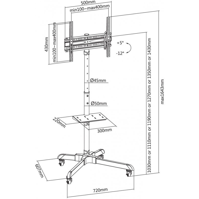 Televizní stolek na velké TV s uhlopříčkou 32"- 55" (81-140cm) a hmotností maximálně 35kg. Středová nosná tyč 103-143cm na kolečkách s aretací, držák vertikálně výklopný +5°/-12°, police 22x30cm max 5kg, Cable managment, rozměry 72x60,7x164,3cm, materiál ocel, barva černá. Uchycení VESA: 100x100, 200x100, 200x200, 300x200, 300x300, 400x200, 400x400..