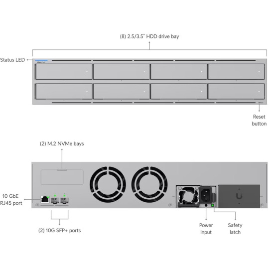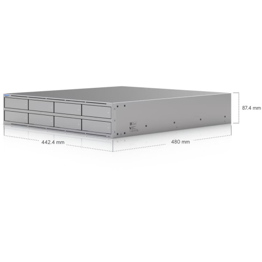 Popis produktu Síťové úložiště UniFi velikosti 2U pro montáž do racku s (8) pozicemi pro 2,5/3,5" pevné disky, (2) sloty pro M.2 NVMe SSD cache, (1) 10 GbE RJ-45 portem a (2) 10G SFP+ porty pro uplink. Poháněn je čtyřjádrovým procesorem ARM Cortex-A57, který je doplněný o 16 GB operační paměti. Disponuje dvěmi redundantními napájecími moduly s možností výměny za provozu. Obsah balení • Zařízení • Napájecí kabel a zdroj • Příslušenství pro montáž do racku Technické parametry Konektory a rozhraní Počet slotů pro HDD:8 Počet M.2 slotů:2 Rychlost LAN:(1) 100M/1G/2.5G/5G/10G Gigabit LAN:Ano Optické rozhraní:(2) 10Gbps Ostatní:Bluetooth Napájení Typ napájení:Ze sítě (230V) Redundantní napájení:Ano Max. spotřeba energie [W]:250 Napájení přes konektor/svorkovnici:230V AC Fyzické charakteristiky Provedení:Rackmount Materiál:Ocel Počet "U" pozic:2 LED indikace:Ano Provozní teplota [°C]:-5 až 40 Hmotnost [kg]:11,5 Šířka [mm]:442 Výška [mm]:87 Hloubka [mm]:480 Hardware Velikost operační paměti [GB]:16 CPU:ARM Cortex-A57.
