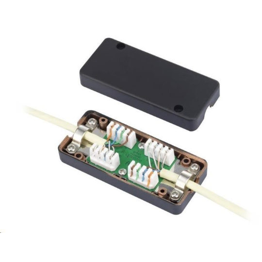 Propojovací box CAT6. Umožňuje propojit kabelové segmenty beze ztráty kvality vedení. Narážecí kontakty.