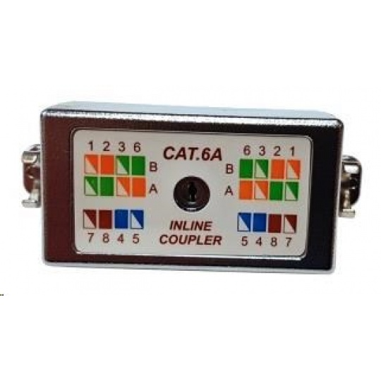 Propojovací box Cat6A, stíněný pokovením. Umožňuje propojit kabelové segmenty beze ztráty kvality vedení. Narážecí kontakty.