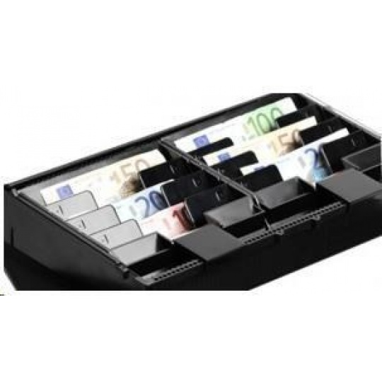 cash drawer, front opening, dimensions (WxHxD): 410x114x415mm, 8 note compartments (vertical), 8 coin compartments, 1 receipt compartment, 3-pos. lock, direct printer připojovací, colour: dark grey.