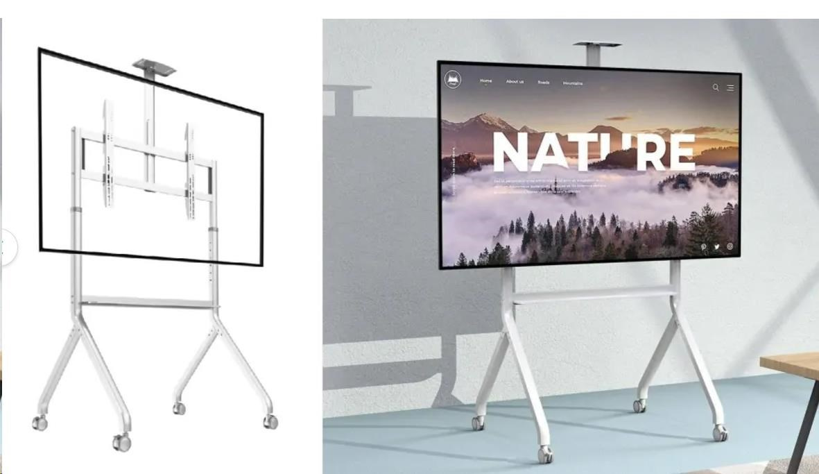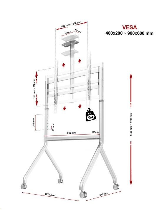 Mobilní stojan pro multimediální tabule, interaktivní monitory a LCD LED TV 60" - 100" Model: NB P200W Stojan na interaktivní tabuli / televizi / monitor NB P200W Charakteristika: Univerzální mobilní televizní vozík / stojan pro velké obrazovky Perfektní řešení pro interaktivní tabule a multimediální obrazovky Široká, stabilní základna se snadným přístupem k dotykovým obrazovkám Nastavení výšky obrazovky Vysoce kvalitní materiály mají za následek velmi pevnou a odolnou konstrukci Výškově nastavitelná police na fotoaparát, kameru nebo jinou AV techniku Přídavná police pod zástěnou na příslušenství Plná shoda se standardem VESA Jednoduchá a rychlá montáž Ideální pro konferenční místnosti, školy, výstavy i pro soukromé použití Čtyři otočná gumová kolečka s funkcí aretace Vysoká nosnost, skvělá stabilita Stojan na multimediální tabule a multimediální dotykové monitory a televize NB P200W TECHNICKÉ PARAMETRY Maximální nosnost 90,9 kg Pro obrazovky 60" - 100" Výškové nastavení v rozsahu 145 ~ 170 cm (každých 5 cm) Gumová otočná kolečka o průměru 75 mm s funkcí aretace Pevná ocelová konstrukce Nastavitelná police na fotoaparát nebo jinou AV techniku, rozměry: Rozměr 256 x 125 mm Spodní police na příslušenství, rozměry: 962 x 99 mm Povrchová úprava: práškový lak Barva: bílá Standard kompatibilní s VESA (rozteč montážních otvorů): VESA 200x200 (rozteč otvorů 200 x 200 mm) VESA 300x200 (rozteč otvorů 300 x 200 mm) VESA 300x300 (rozteč otvorů 300 x 300 mm) VESA 400x200 (rozteč otvorů 400 x 200 mm) VESA 400x400 (rozteč otvorů 400 x 400 mm) VESA 600x400 (rozteč otvorů 600 x 400 mm) VESA 800x400 (rozteč otvorů 800 x 400 mm) VESA 800x500 (rozteč otvorů 800 x 500 mm) VESA 800x600 (rozteč otvorů 800 x 600 mm) VESA 900x600 (rozteč otvorů 900 x 600 mm) VESA 200x200 ~ 900x600 mm (všechny kombinace otvorů v tomto rozsahu).