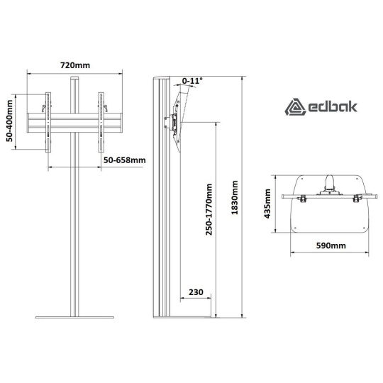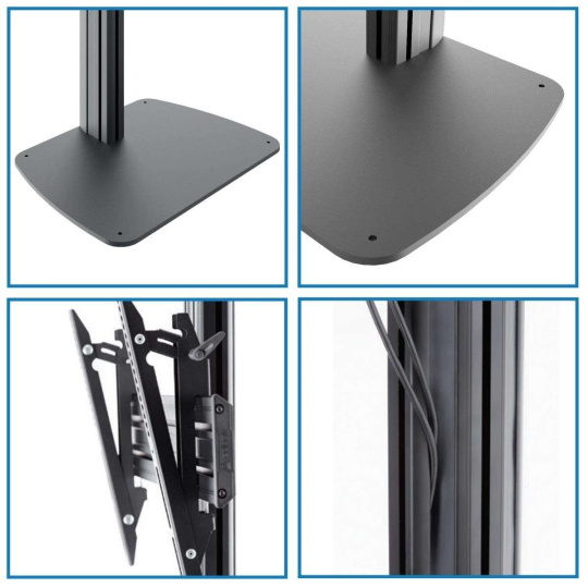Profesionální Tv stojan Edbak STDV100 Stojan na Tv a monitory 40-75", nastavitelná výška obrazovky 250-1770mm, náklon 0°/-11°, vedení kabeláže, VESA 75x75 až 600x400, nosnost 80kg, Profesionální designový stojan pro zavěšení televizorů, monitorů a dotykových obrazovek s úhlopříčkou 40" až 75". Stojan je vyroben z hliníku, podstava je z litiny o rozměrech 590x435x10mm. Podstavu je nutné ukotvit do podlahy nebo připraveného podstavce - není samostojný. Obrazovky je na stojanu možné nastavit do potřebné výšky od 250mm až do 1770mm (vzdálenost od podlahy po střed obrazovky) a nastavit náklon od 0° až do -11°. Stojan je možné zakoupit včetně poličky na příslušenství a poličky na kameru. Stojan podporuje VESA standardy 75x75 až 600x400 a má nosnost 80kg. Materiál hliník a litina. Poličky jsou kovové. Instalační materiál. Záruka 5 let. Profesionální designový podlahový stojan na televize, monitory a dotykové obrazovky Edbak STDV100 Technické údaje: nosnost 80kg podporuje VESA standardy 75x75 až 600x400 na televize, monitory a dotykové obrazovky 40" až 75" celková výška stojanu 1830mm nastavitelná výška obrazovky 250-1770mm (od podlahy po střed obrazovky) nastavitelný náklon obrazovky 0° až -11° podstava s otvory pro ukotvení do podlahy rozměry podstavy 590x435x10mm možnost zakoupení i s poličkou na příslušenství 400x300mm, nosnost 10kg možnost zakoupení i s poličkou na kameru 250x200mm, nosnost 10kg materiál hliník a litina profesionální výrobek nejvyšší kvality barevné provedení černé záruka 5 let Detaily Tv stojanu Edbak STDV100 Tv stojany Edbak STDV100 podporují VESA standardy: VESA 75x75 VESA 100x100 VESA 200x100 a 100x200 VESA 200x200 VESA 300x200 a 200x300 VESA 300x300 VESA 400x200 a 200x400 VESA 400x300 a 300x400 VESA 400x400 VESA 600x400 Stojan je možné zakoupit včetně poličky na příslušenství a poličky na kameru. Poličky jsou kovové a mají nosnost 10kg..