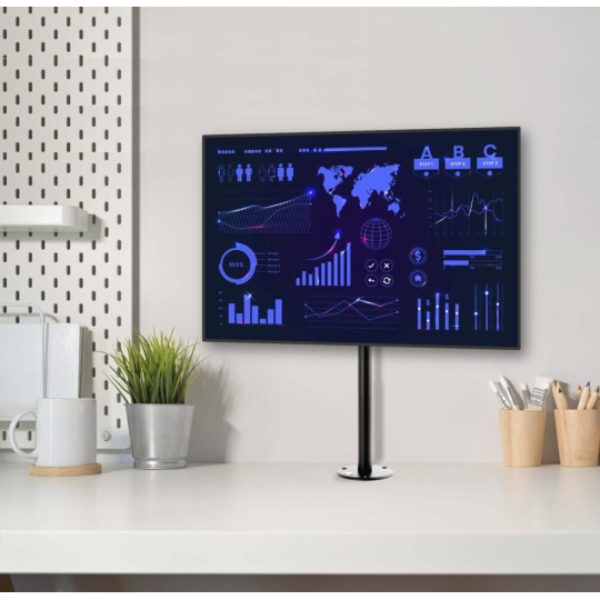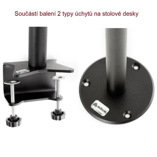 Stolní držák na dotykové monitory EDBAK SV30 Držák na Tv a monitory 15-43", nastavitelná výška 280-450mm, nastavení náklonu -30°/+90°, otáčení do stran +/-180°, 2 typy stolních úchytů, VESA 75x75 a 100x100, nosnost 10kg Stolní držák pro monitory a televize 15-43", který vyniká svou vynikající kvalitou, nastavitelností a aretací obrazovky v nastavené poloze. Nastavitelná výška v rozmezí 28-45cm od stolové desky, otočení do strany +/- 180°, naklápění ve velkém rozsahu od -30° až do +90° (obrazovka vodorovně). Držák je dodáván se 2 typy stolního uchycení - svěrák pro uchycení na okraje stolů a litinová skruž s otvory pro ukotvení do stolové desky. Držák podporuje VESA standardy 75x75 a 100x100 a má nosnost 10kg. Díky pevné konstrukci a aretace polohy je držák vhodný nejen na monitory a televize, ale i na dotykové obrazovky. Záruka 5 let. Stolní držák na monitory EDBAK SV30 Technické údaje: nosnost 10kg vhodný pro monitory, televize a dotykové obrazovky 15" - 43" podporuje VESA standardy 75x75 a 100x100 nastavitelná výška 280 až 450mm otočný +/- 360° sklopný +90°/-30° volba vhodného typu uchycení na stolovou desku - na okraj nebo do prostoru fixace v požadované poloze snadná instalace barevné provedení černé záruka 5 let Stolní držáky na monitory nebo televize Edbak SV30 Držák podporuje VESA standardy pro uchycení monitorů: VESA 75x75 VESA 100x100 Na držáky EDBAK SV30 je možné zavěsit veškeré monitory a televizory, jejichž hmotnost je maximálně 10kg a které podporují některý z výše uvedených VESA standardů. Výška televize nebo monitoru (ne úhlopříčka) nesmí být větší jak 36cm..