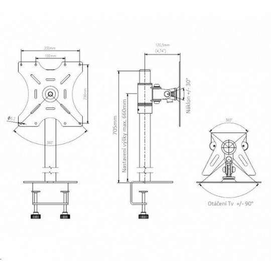 Technické údaje: nosnost 15kg podporuje VESA standardy 75x75 až 200x200 možnost zakoupení rozšíření VESA standardu až na 400x400 doporučujeme na Tv 30 až 46 palců na všechny typy a značky televizorů otáčení Tv do stran +/- 90° náklon +/- 30° nastavení výšky obrazovky, max. 660mm korekce roviny obrazovky možnost otočení obrazovky na výšku na výběr ze 2 typů uchycení na stolovou desku profesionální konstrukce výborná kvalita barevné provedení černé záruka 5 let Držák EDBAK MSV2 podporuje VESA standardy: VESA 75x75 VESA 100x100 VESA 200x100 a 100x200 VESA 200x200 možnost zakoupení nástavce VESA 400 - rozšíření na 300x200, 300x300, 400x200, 400x300 a 400x400.
