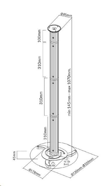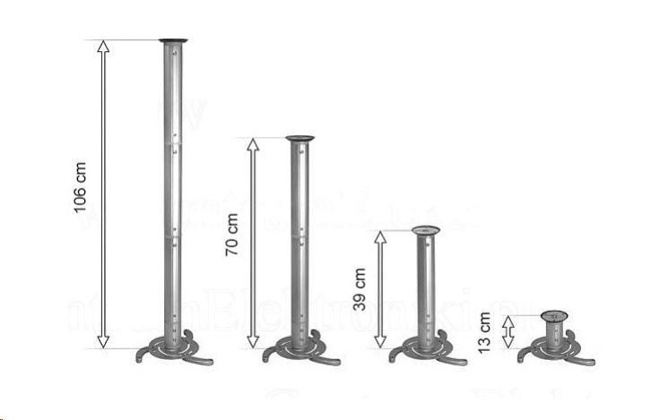 Kompletní specifikace Stropní držák projektoru Fiber Mounts M5C17 Délkově nastavitelný, otočný, sklopný držák projektoru na strop, stříbrný, nosnost 10kg, univerzální na všechny běžně dostupné projektory Stropní držák projektoru s nastavitelnými vzdálenostmi od stropu Fiber Mounts M5C17 Univerzální, kvalitní polohovací držák pro stropní zavěšení projektorů a dataprojektorů. Držák je vhodný na 99% všech dostupných projektorů. Součástí balení jsou délkové nástavby, díky kterým je projektor možné zavěsit od stropu v délce od 13 až do 106cm, naklopit o 15° a otáčet ho do stran. Držák je vyroben z hliníku. Barevné provedení stříbrné. Držák pro stropní uchycení projektoru Fiber Mounts M5C17 Technické údaje: nosnost 10kg univerzální, vhodný na 99% běžně dostupných projektorů náklon +/- 15° natočení do stan +/- 360° nastavitelná délka od stropu 13, 39, 70 nebo 106cm barva stříbrná hliníková konstrukce záruka 2 roky.