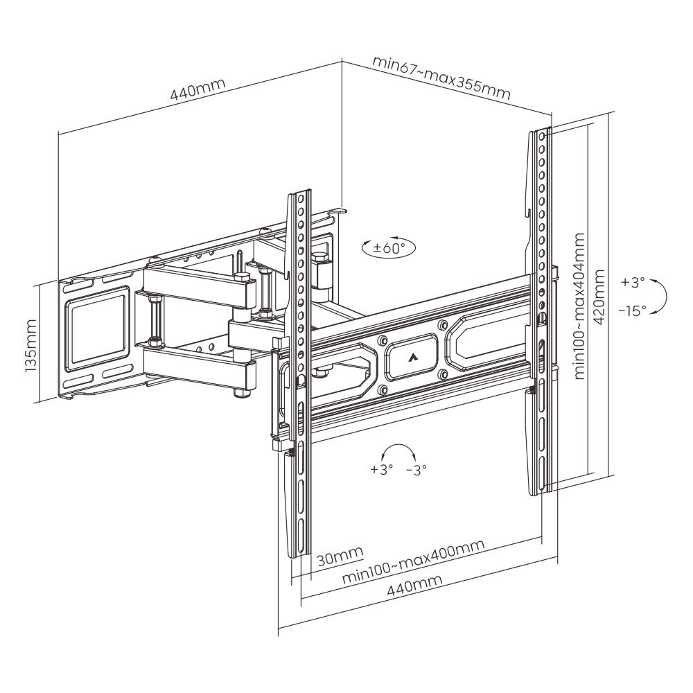 Televizní držák Fiber Mounts FM79 Držák na Tv 30-70", VESA 100x100 až 400x400, otáčení do stran +/-60°, naklápění +3°/-15°, korekce roviny +/-3°, vzdálenost Tv od zdi 67-355mm, pevná a spolehlivá konstrukce s nosností 40kg Televizní držák Fiber Mounts FM79 Technické údaje: nosnost 40kg podporuje VESA standardy 100x100 až 400x400 doporučujeme na televize s úhlopříčkou 30" až 70" nastavitelná vzdálenost televize od zdi 67-355mm otáčení do stran až +/- 60° naklápění Tv od +3° / -12° korekce roviny obrazovky +/- 3° montážní plocha na zeď 440x135mm ocelová konstrukce s vysokou pevností úchytky na kabely barevné provedení černé prodloužená záruka na 5 let Televizní držák Fiber Mounts FM79 podporuje VESA standardy: VESA 100x100 VESA 150x150 VESA 200x100 a 100x200 VESA 200x200 VESA 300x200 a 200x300 VESA 300x300 VESA 400x200 a 200x400 VESA 400x300 a 300x400 VESA 400x400 Na držáky Fiber Mounts FM79 je možné zavěsit veškeré televize, jejichž hmotnost není vyšší jak 40kg a které podporují některý z výše uvedených VESA standardů. Uváděná velikost / úhlopříčka televize není podstatná a neurčuje, zda je Tv na držák vhodná..