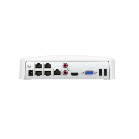 - Porty: 4x LAN PoE RJ45 port 10/100 Mb/s pro připojení kamer, 1x LAN RJ45 port 10/100 Mb/s pro připojení k Internetu, 2x RCA zvuk, 1x HDMI, 1x VGA, 2x USB 2.0, 1x Napájecí Jack