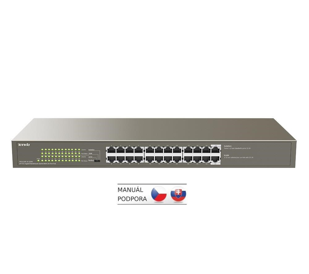 Tenda TEG1124P-24-250W přepíná data pomocí 24 portů RJ45, 24 portů 10/100/1000 Mb/s podporuje PoE802.3af/at. Switch má ochranu proti přepětí 6kV. Podpora přepojování uzlů v módu Store-and-Forward. Full-duplex kontrola toku 802.3x, half-duplex kontrola toku v režimu Back-Pressure.