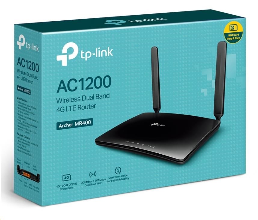 TP-Link Archer MR400 OneMesh WiFi5 router (AC1200, 4G LTE, 2,4GHz/5GHz, 3x100Mb/s LAN, 1x100Mb/s LAN/WAN, 1xmicroSIM)