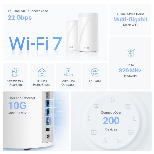 | Advanced Functions | • Multi-Link Operation (MLO) • 320 MHz Channel • 4K-QAM • Multi-RUs • Works with Alexa and Google Assistant • IoT Network |