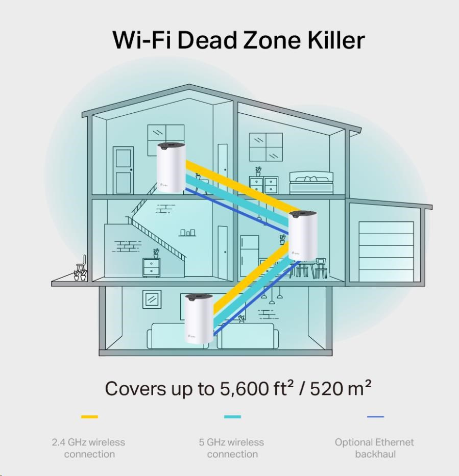 | WiFi Range | 3-5 Bedroom Houses (3-pack) TP-Link Mesh Technology Optional Ethernet backhaul works together to link Deco units to provide seamless coverage 3× Antennas (Internal) Multiple antennas form a signal-boosting array to cover more directions and large areas Beamforming Concentrates wireless signal strength towards clients to expand WiFi range |