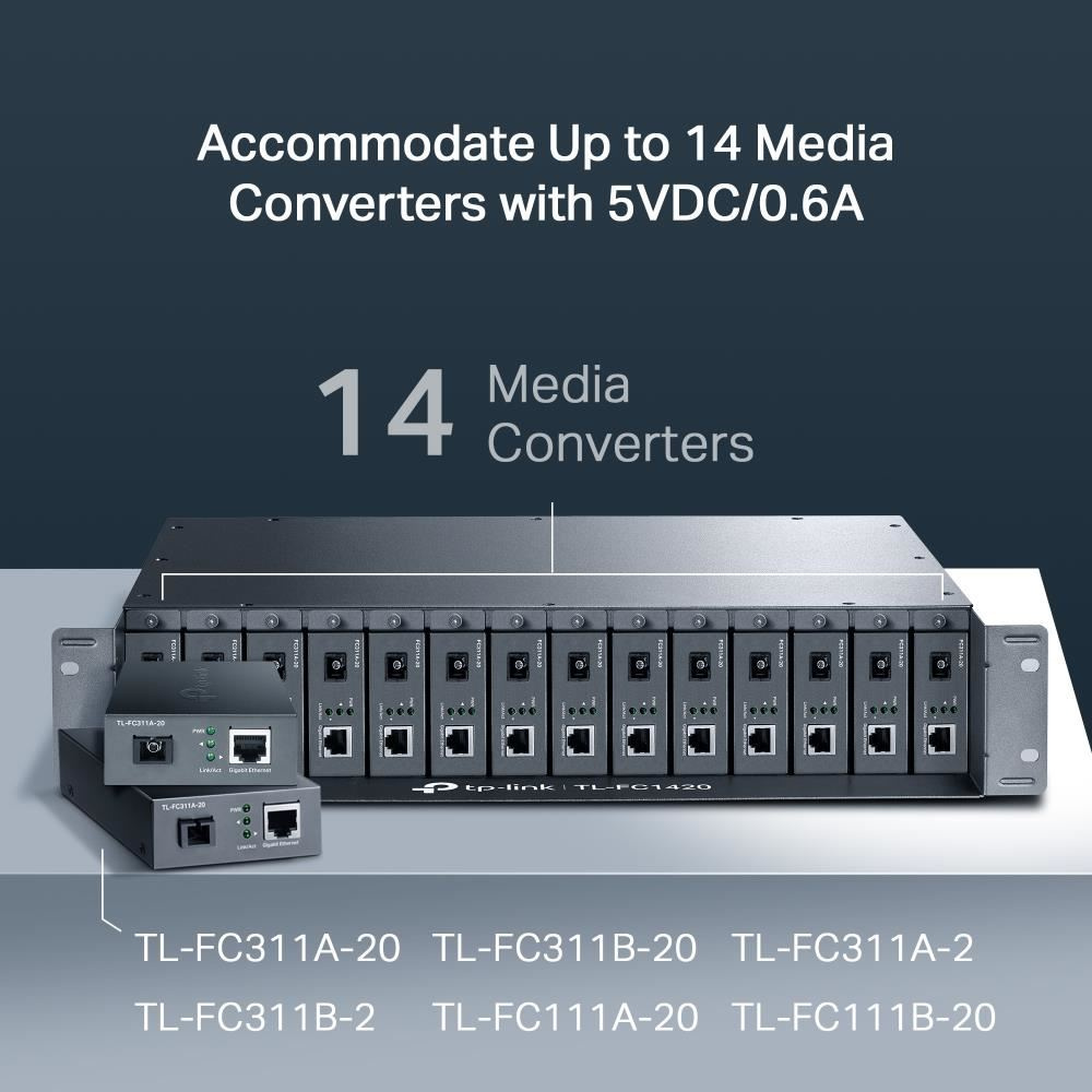 14slotové rackové šasi TL-FC1420 je speciálně určeno pro usazení 14 média konvertorů od společnosti TP-Link pro zajištění centrálního napájení, čímž šetří místo a napájecí kabely. Nepřetržitý provoz je pro komunikaci přes optické vedení velmi důležitý, proto je šasi vybaveno volitelným redundantním napájecím zdrojem a funkcí výměny za provozu, které umožňují instalaci / odebrání konvertoru bez vypnutí napájení šasi. Pro stabilizaci provozního výkonu a prodloužení životnosti jsou navíc uvnitř instalovány dva chladicí větráky. Společně s řadou FC média konvertorů Gigabit / Fast Ethernet představuje zařízení TL-FC1420 ideální řešení pro vaši síť vyžadující převod médií. * Zařízení TL-FC1420 podporuje TP-Link média konvertory TL-FCXXX verze 1.0 a vyšší. ** TL-MCRP100 V2 lze použít jako redundantní napájecí modul v šasi TL-FC1420.