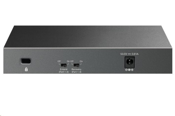 | Advanced Features | • Extend Mode Button (Ports 1–4, Up to 250 m PoE power supply and data transmission) • PoE Auto Recovery Button (Ports 1-4) • Compatible With IEEE 802.3af/at Compliant PDs • Mac Address Auto-Learning and Auto-Aging • IEEE 802.3x Flow Control • Green Technology |