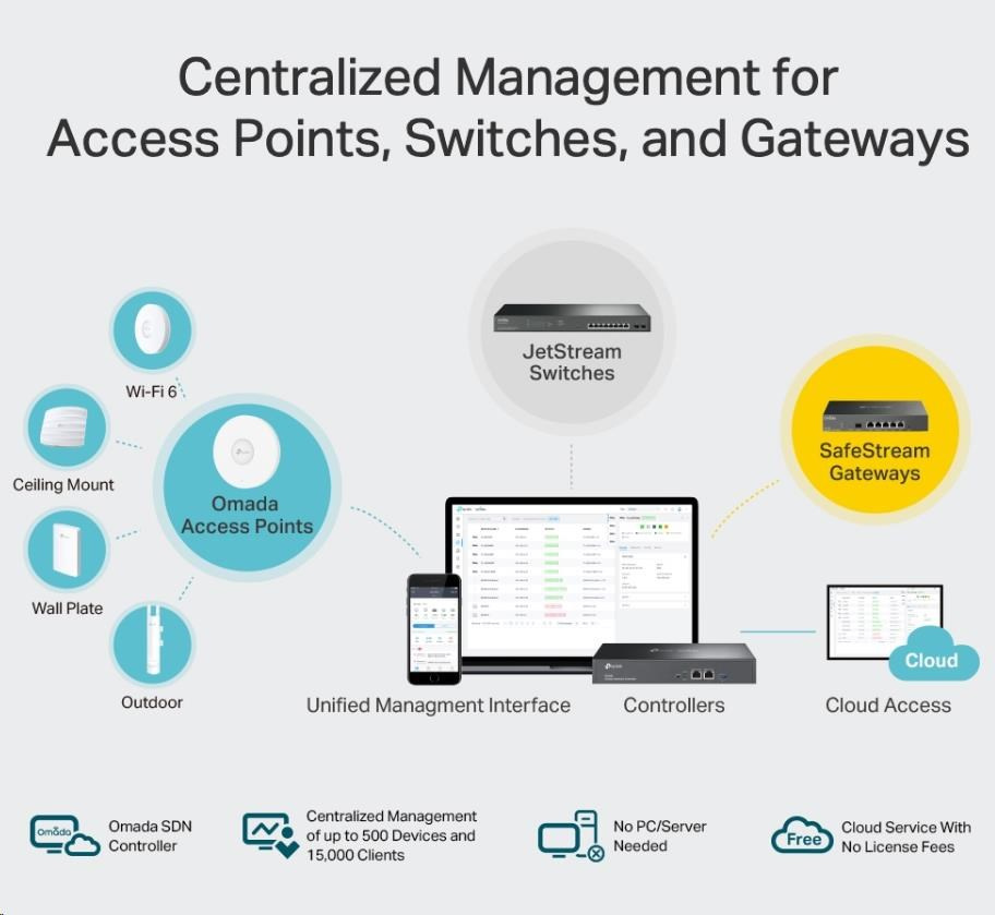 - Centralizovaná správa - až 500 přístupových bodů Omada, 100 switchů JetStream a 100 routerů SafeStream.